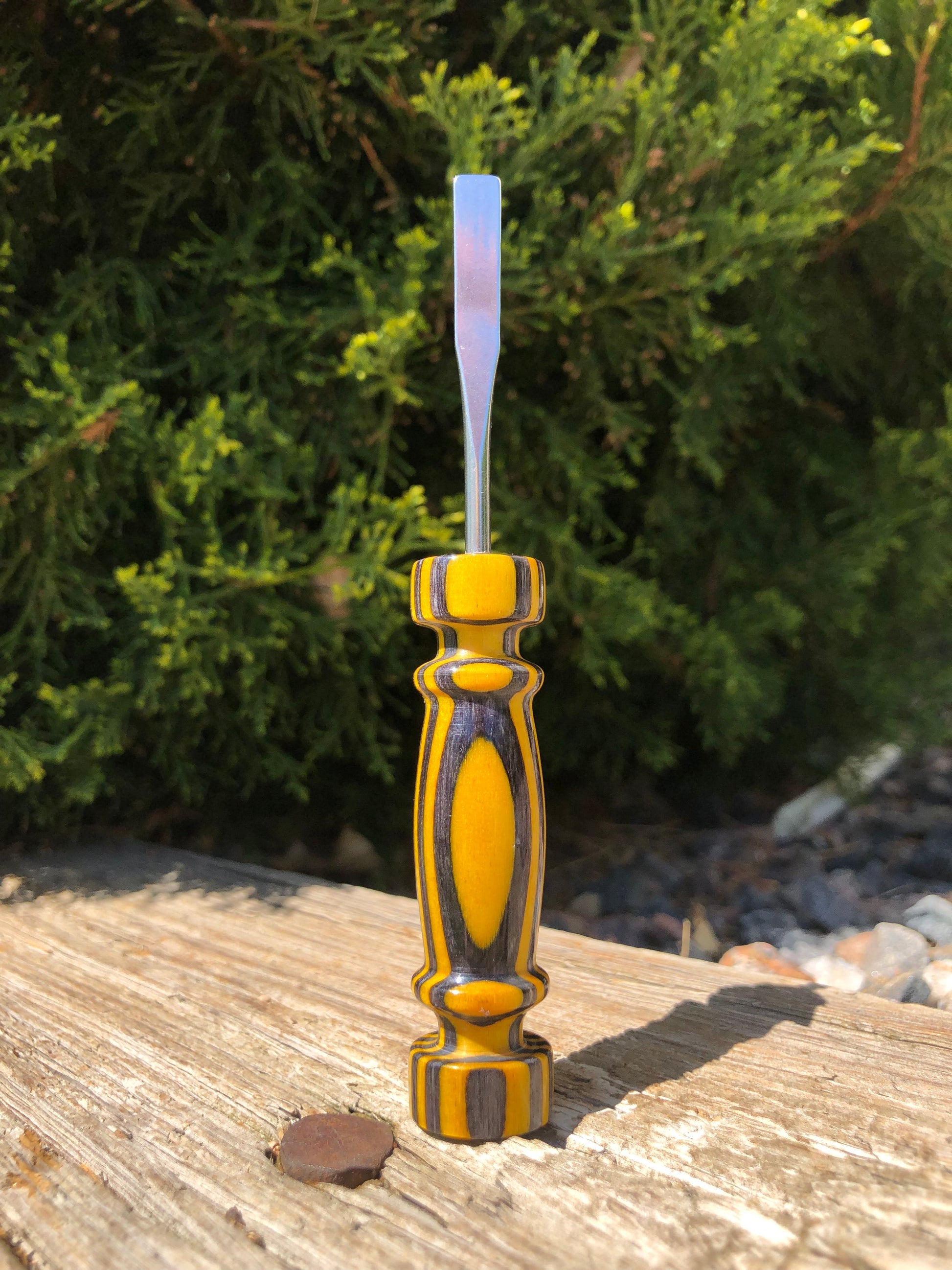 Handle made from Bumblebee wood, dyed and layered with yellow and dark gray to make an unmatched appearance. It also has a CA finish that is much more durable, glossy, smooth, and is resistant to hand oils/water! The tip is made from 100% stainless steel.