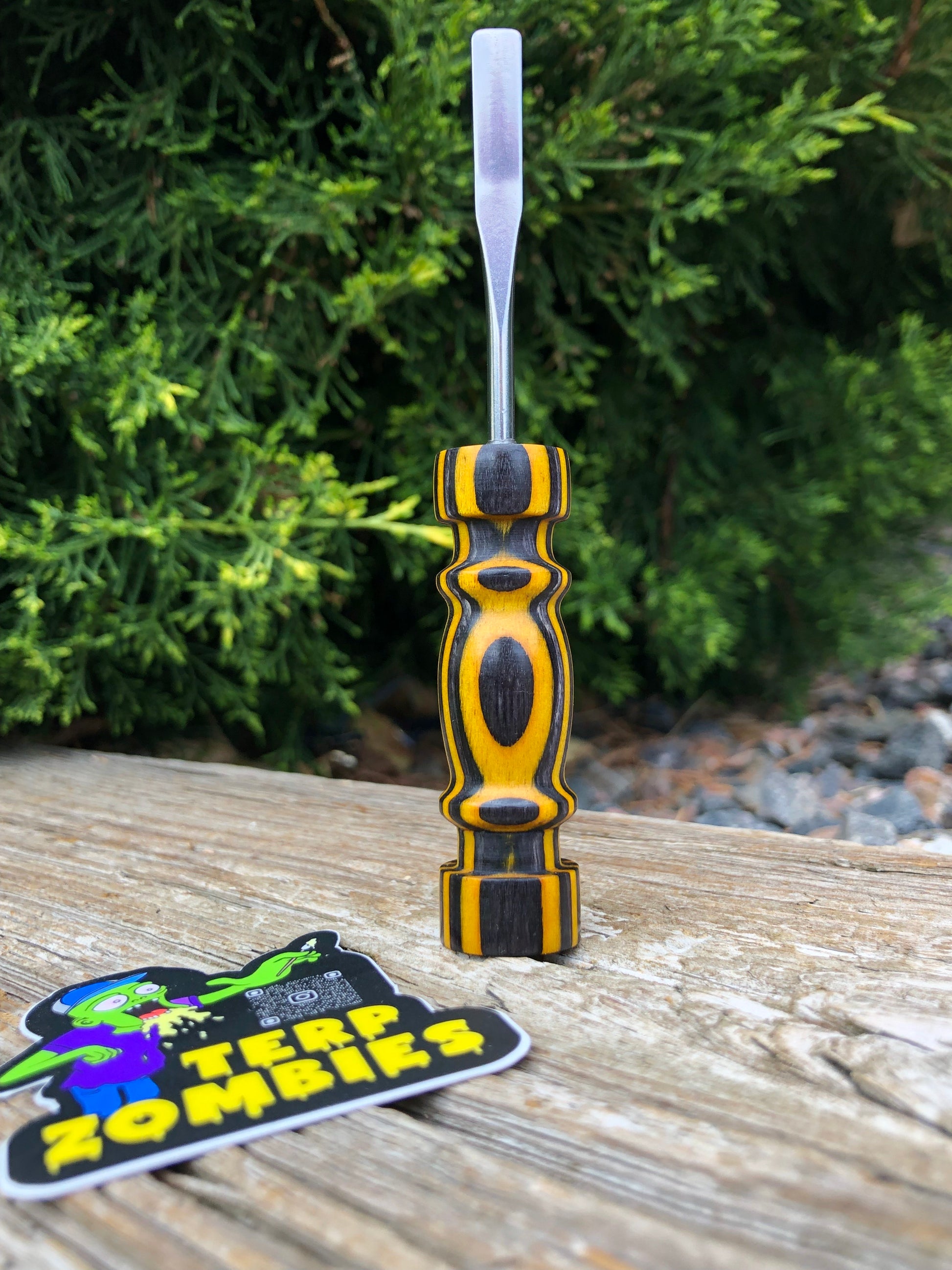 Handle made from Bumblebee wood, dyed and layered with yellow and dark gray to make an unmatched appearance. The tip is made from 100% stainless steel.