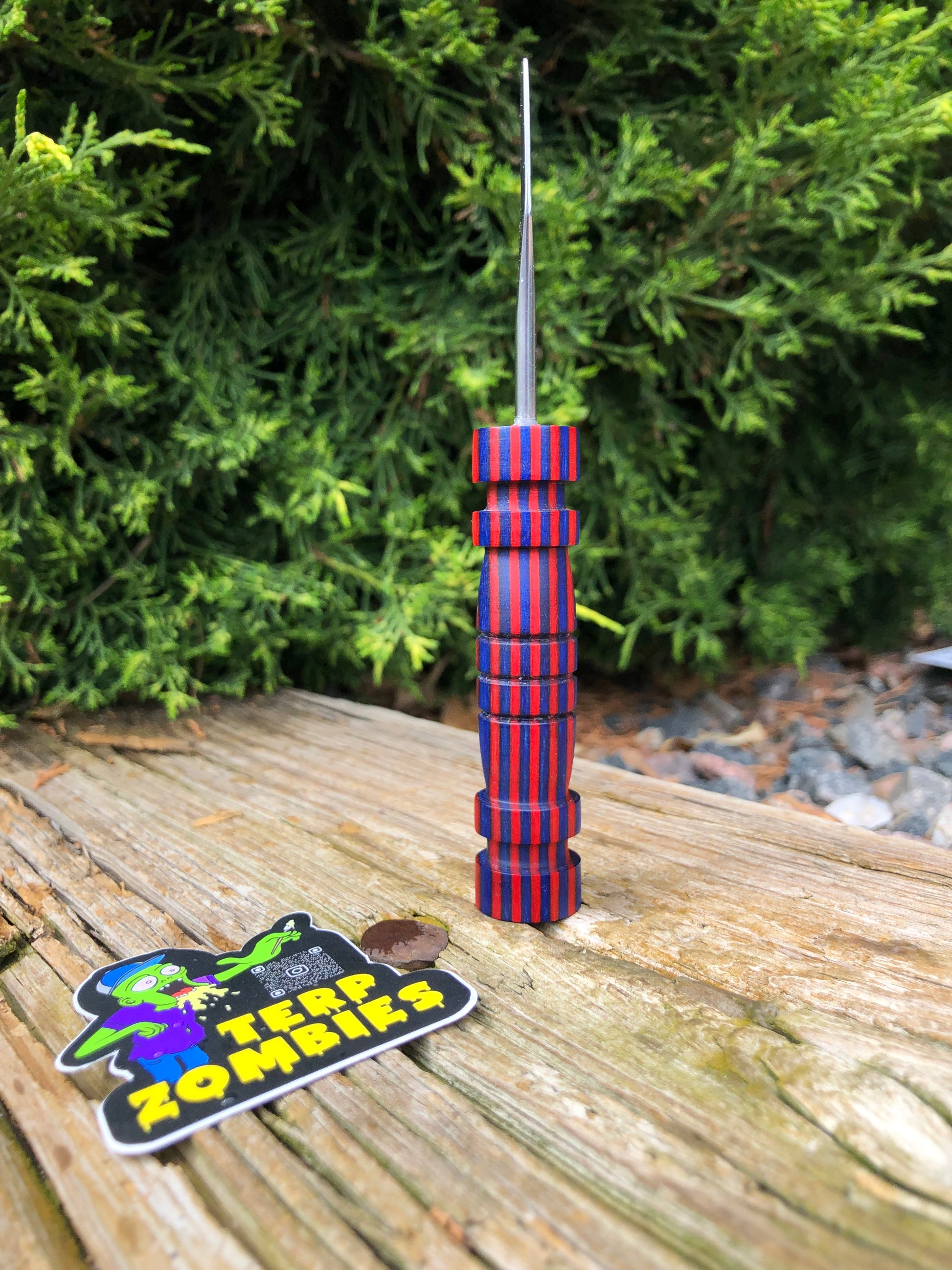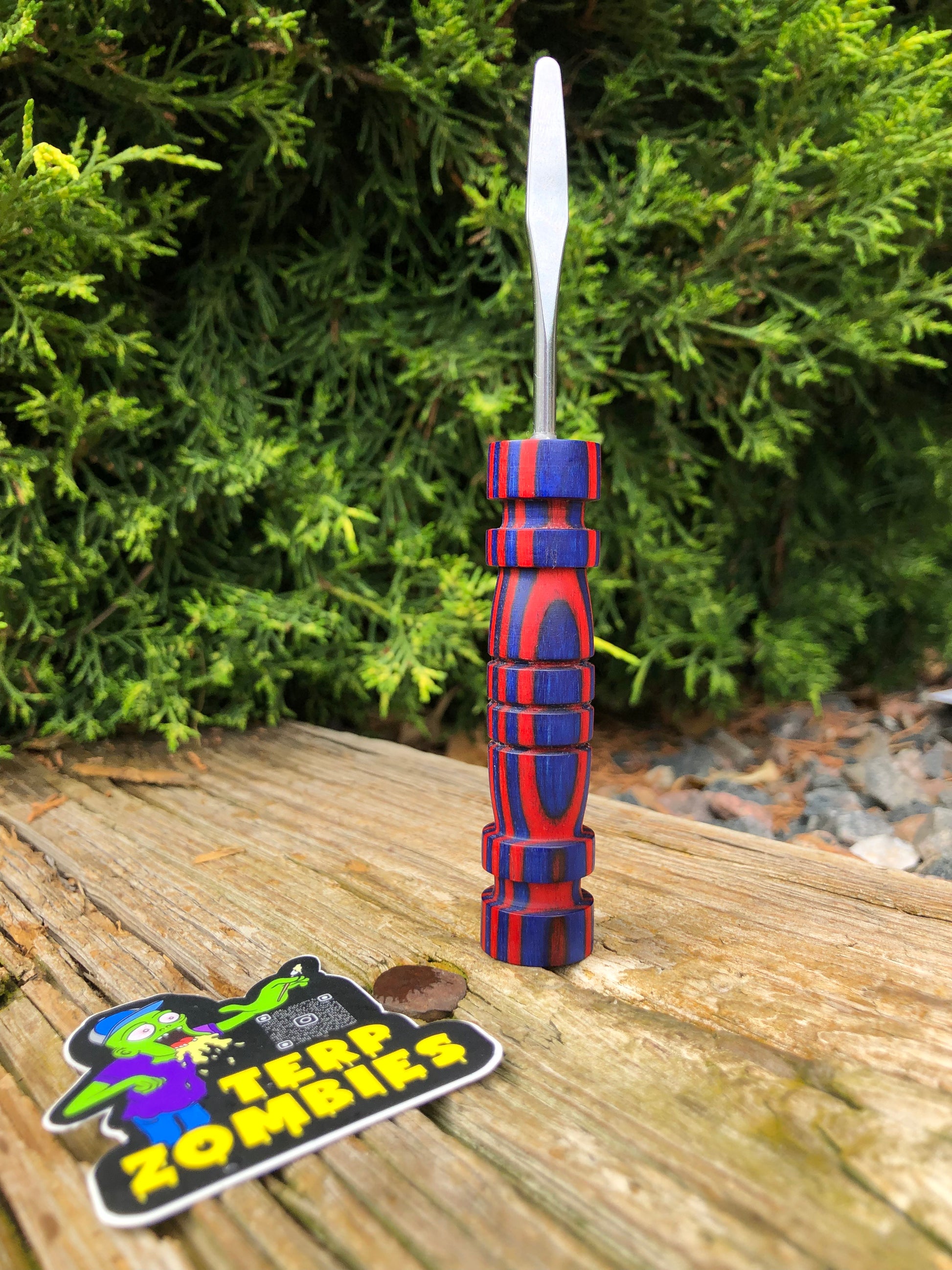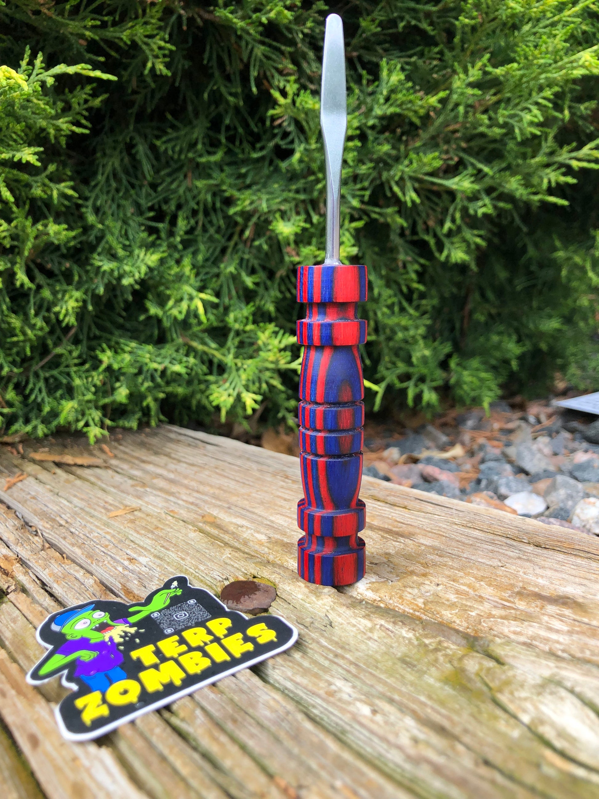 Handle made from "Patriot" wood, dyed and layered with shades of red and blue to make an unmatched appearance. The tip is made from 100% stainless steel.